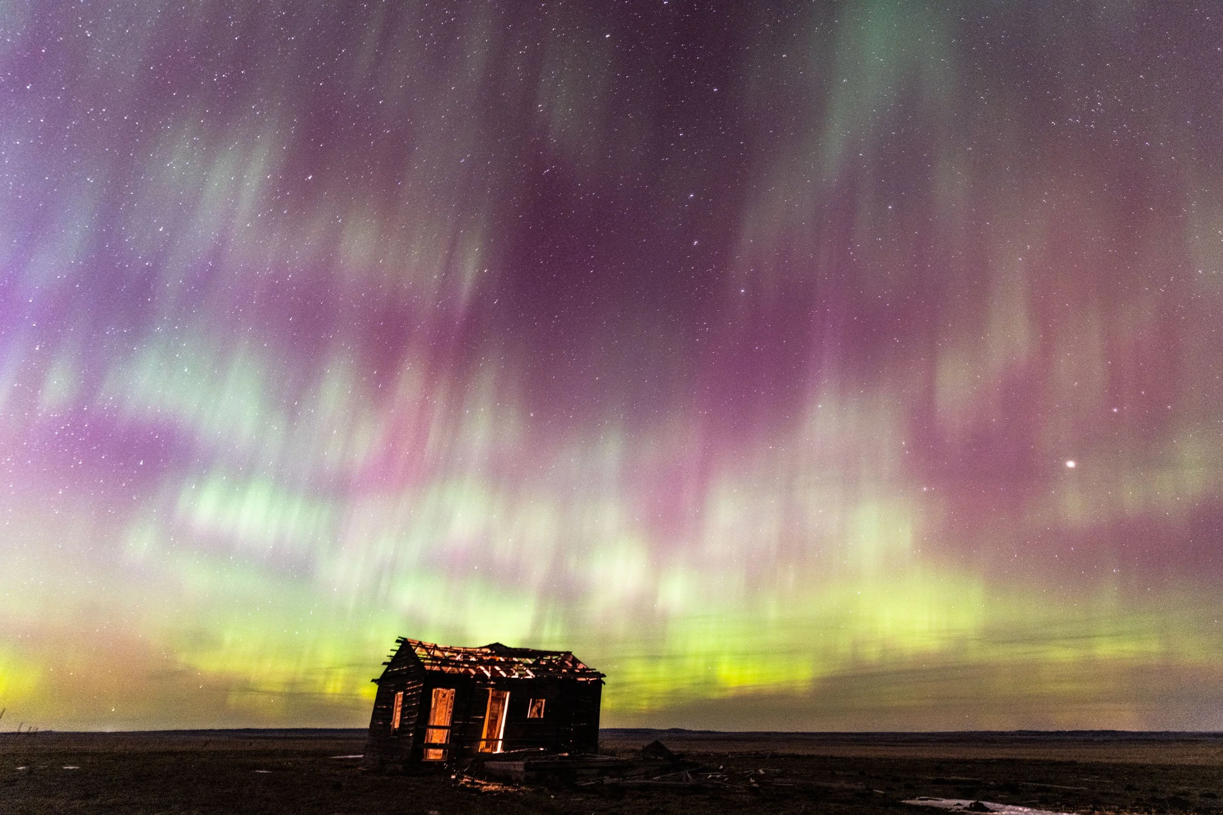As I turned and looked to the south, I noticed a band forming in that direction. After snapping a couple quick shots I then positioned myself on the north side of the homestead in order to capture the aurora and STEVE (Strong Thermal Emission Velocity Enhancement) with light pollution from Billings, MT in the background.