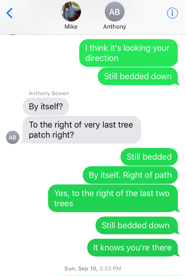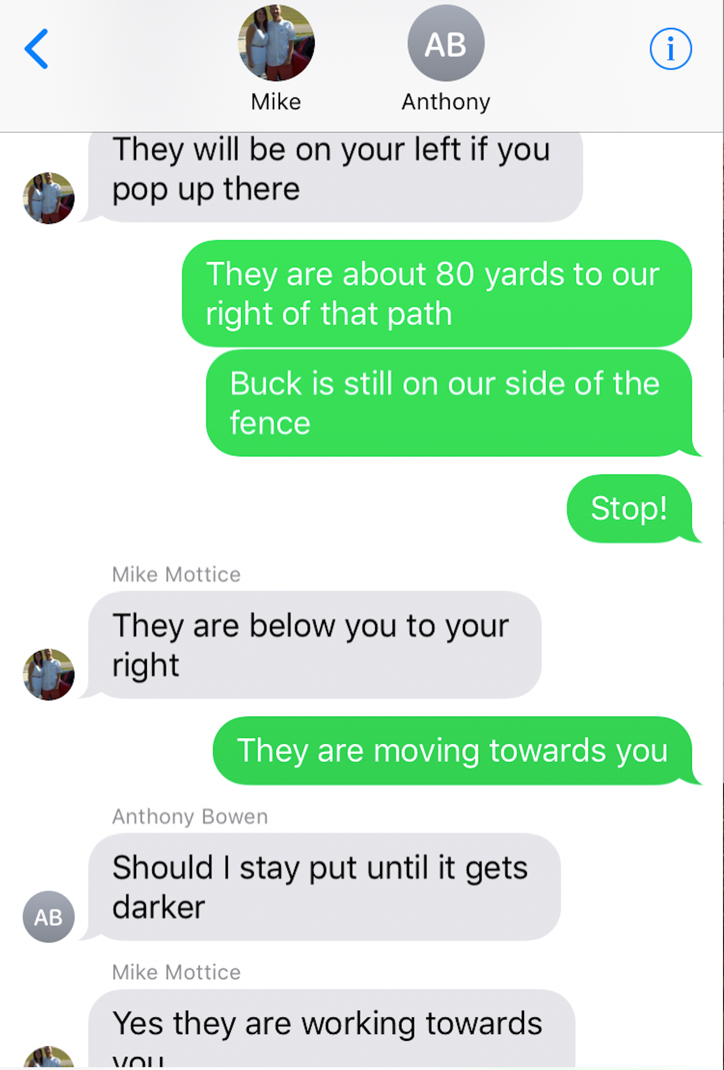 Sample of the texts between Anthony and I as he was stalking the antelope.